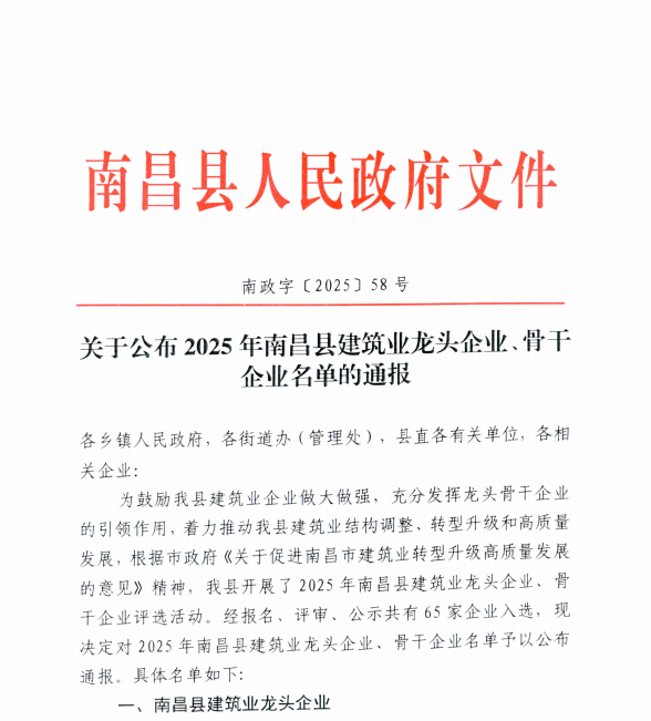 近日,南昌县人民政府发布《关于公布2025年南昌县建筑业龙头企业、骨干企业名单的通报》,我司荣获南昌县建筑业“龙头企业”称号,该称号的评定严格依据企业产值规模、纳税情况、工程质量、安全生产等多项指标,我司凭借稳定的经营业绩、行业领先的项目管理水平、高度的社会责任感,在激烈竞争中脱颖而出,获得主管部门及评审专家的一致认可。